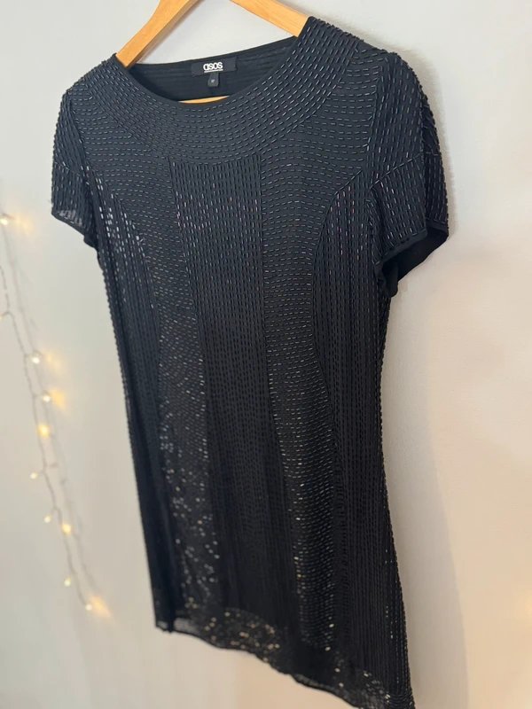 Stunning black beaded mini dress from ASOS with delicate all-over bead detailing that creates a beautiful textured shimmer. The dress features a flattering relaxed shift silhouette and a striking low scoop open back, making it perfect for evenings, parties or festival outfits.