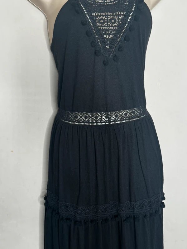 Beautiful black maxi dress from ASOS featuring a halter neck tie and boho-style crochet lace detailing. Lightweight and flowing with tiered skirt panels and decorative trim, perfect for summer holidays, festivals, or evening events.