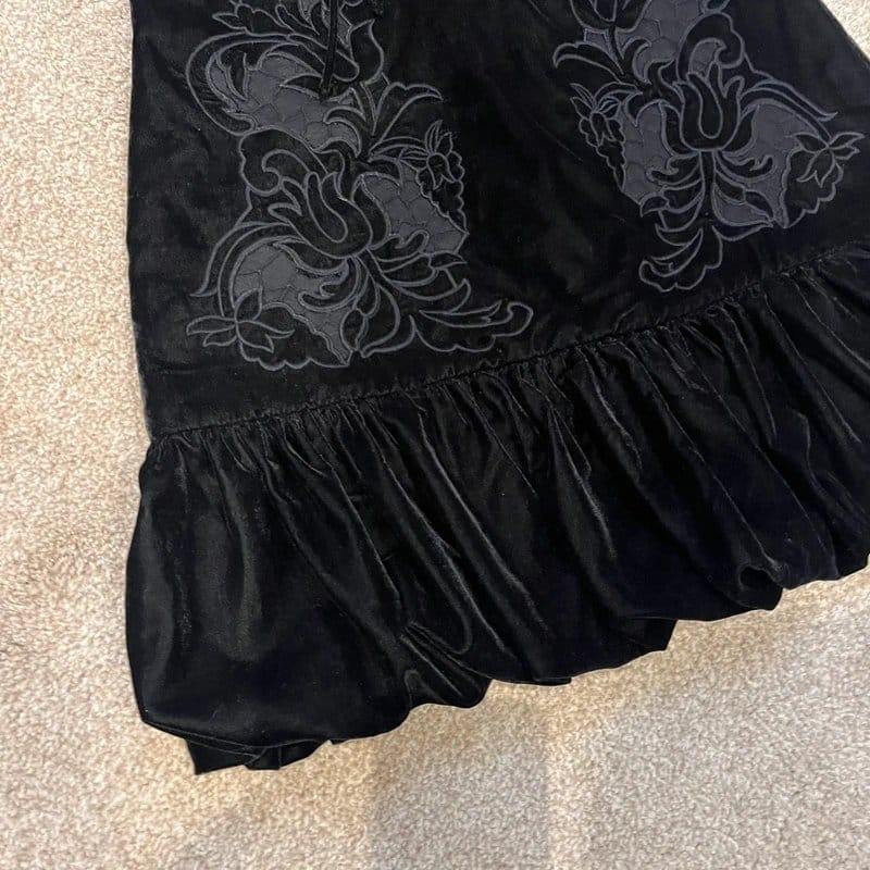 This ASOS Black Chiffon Trim Ruffle Mini Dress features a velvet-like fabric with intricate floral embroidery and a ruffled hem. Ideal for casual outings or evening events.