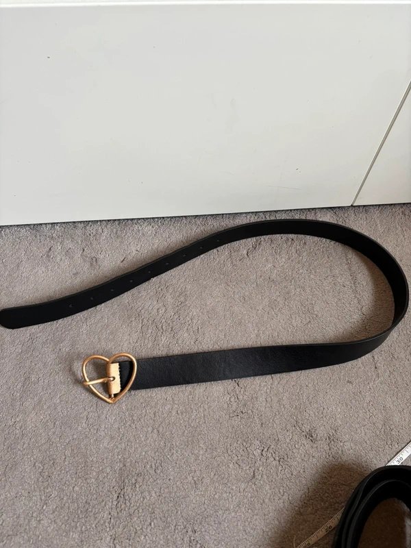 This belt features a black faux leather strap with a gold heart buckle, offering a chic and stylish accessory.