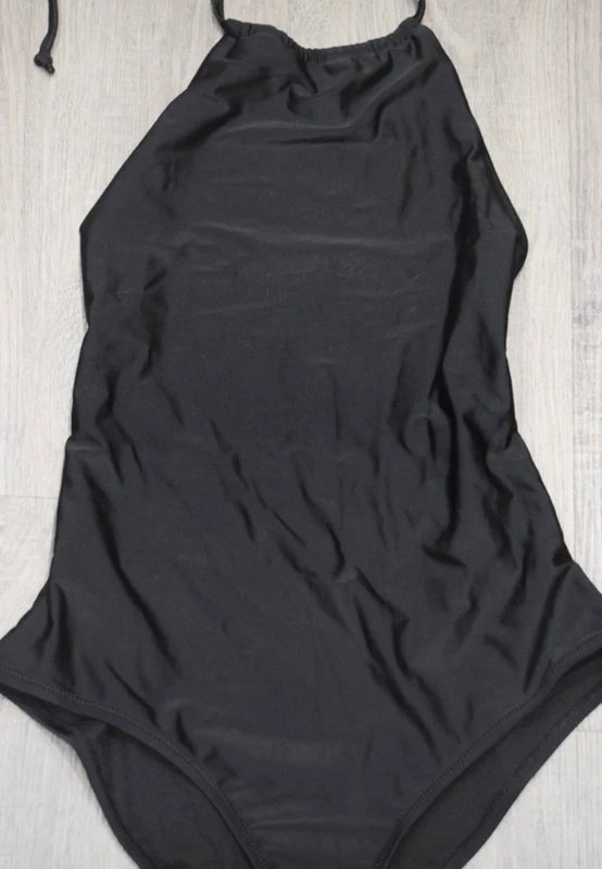 This black halter neck swimsuit by ASOS boasts a low back design, perfect for beach outings and pool parties.