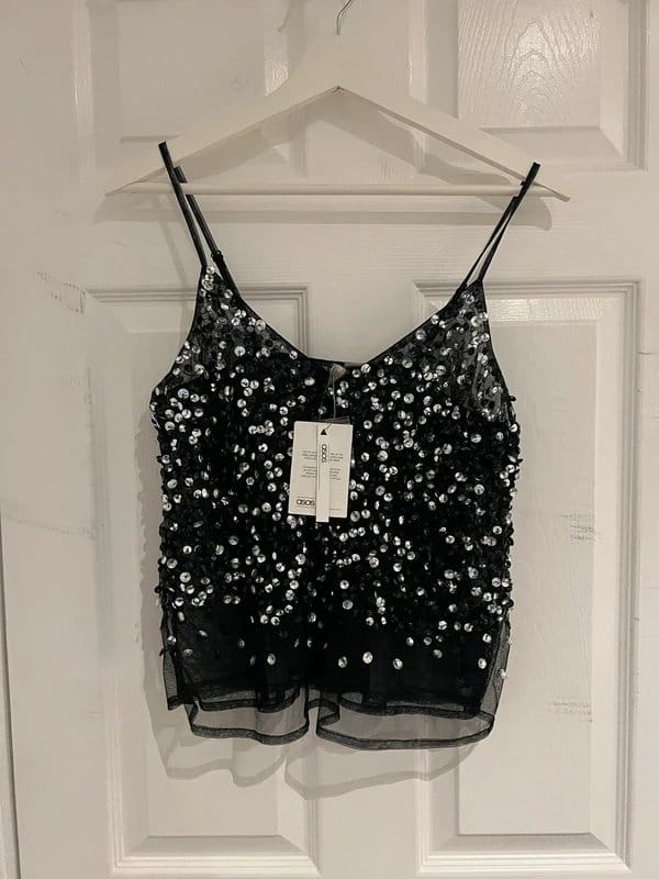 This black sequin cami top by ASOS features a sheer mesh fabric with silver sequin embellishments for a glamorous touch. Perfect for evening wear or special occasions.