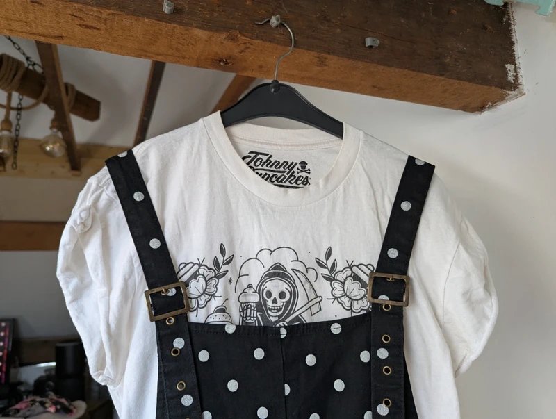 The ASOS Polka Dot Dungarees Jumpsuit in Black and White is available in sizes S.