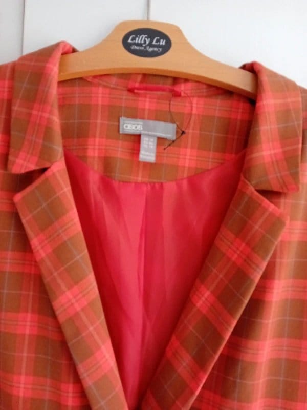 Stylish ASOS blazer in a vibrant red and brown plaid pattern. Features a classic double-breasted front, functional pockets, and a slim fit for a flattering silhouette. Perfect for adding a bold statement to your work wardrobe.
