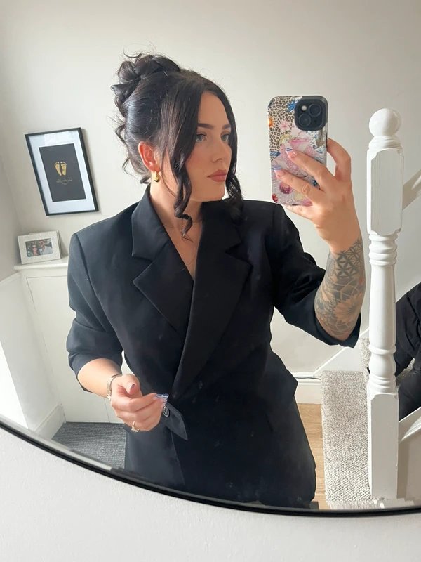 A black blazer with a double-breasted front, this piece offers a structured silhouette perfect for work or smart-casual occasions. The lapel collar and button closure add a touch of formality.