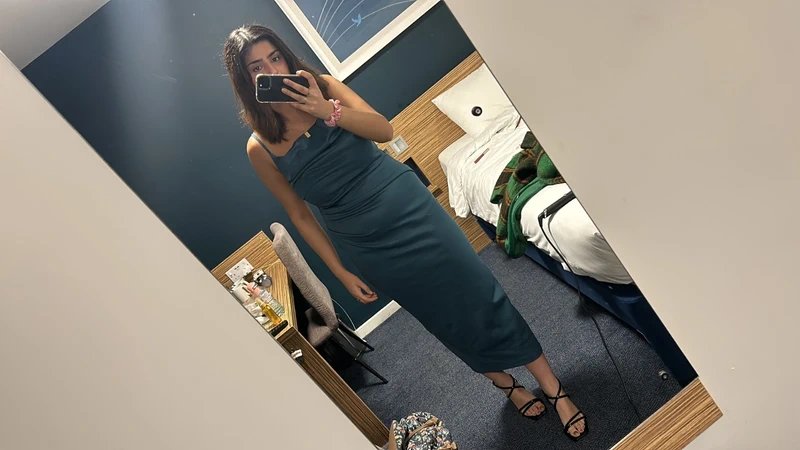 This beautiful blue/teal midi dress from ASOS features a square neckline, thin straps, and a ruched detail. The structured fit hugs the body perfectly, making it ideal for nights out, parties, or special occasions.