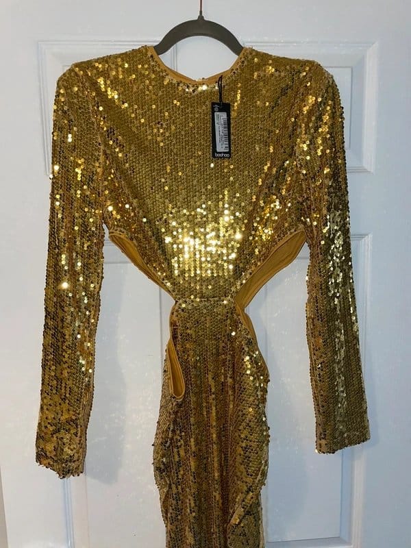 This gold sequin dress by ASOS features a cut-out design and a zip-up back. The UK size 10 dress is perfect for evening events and parties.