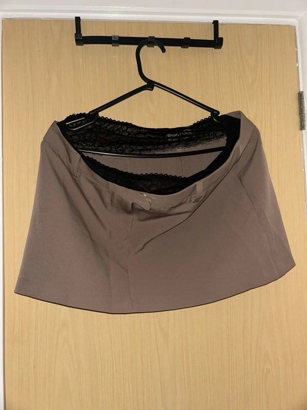 Chic brown mini skirt with a black lace trim around the waist. Made from a smooth, durable fabric, this skirt features a high waistline and a slightly flared shape.