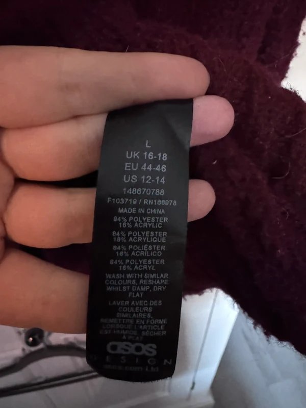 The Burgundy ASOS Arm Stitch Jumper features a round neckline and long sleeves, making it perfect for cooler weather. Crafted from a blend of polyester, acrylic, and other fibers, it offers a comfortable and stylish addition to any wardrobe.
