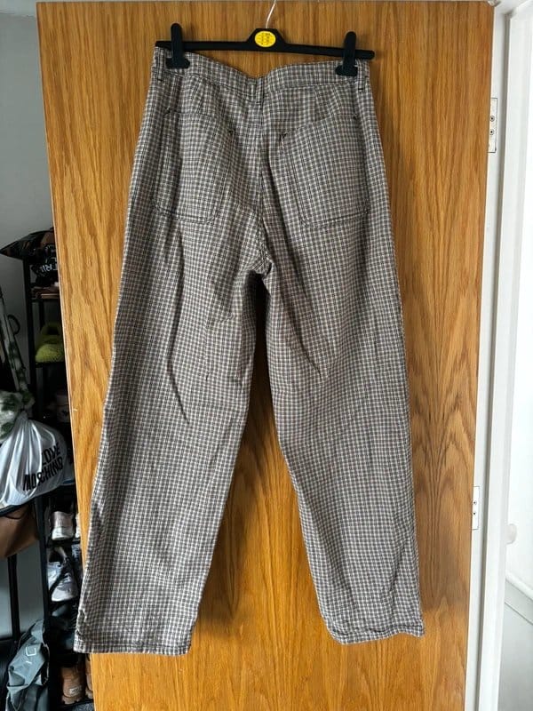 High waisted cargo pants with multiple pockets, perfect for an urban chic look. Crafted from cotton fabric for durability and comfort, these pants are long in length and come in a brown checkered pattern.