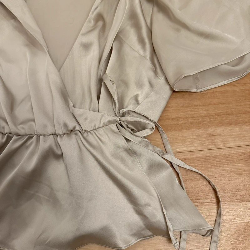 The ASOS champagne satin wrap blouse features a V-neckline and short flutter sleeves. This elegant piece is perfect for a variety of occasions.