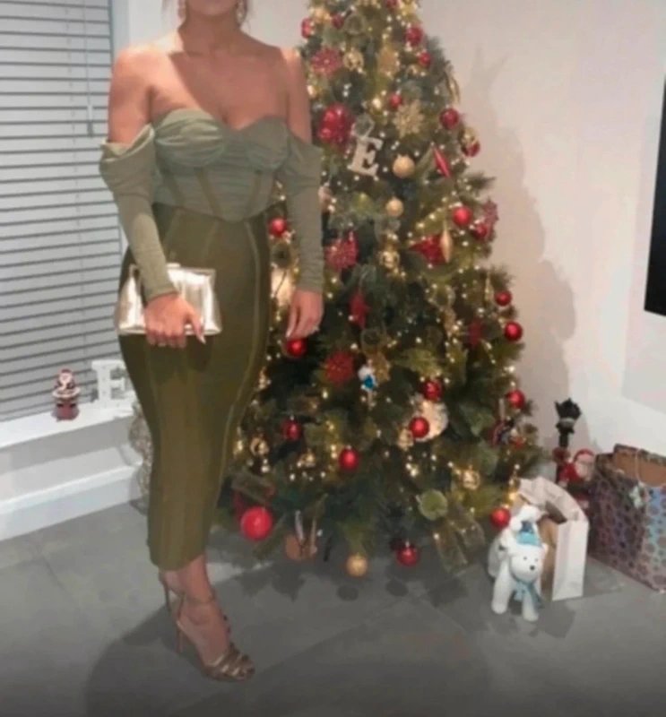 Designed in dark green, this off-shoulder long-sleeve midi dress features a corset silhouette, perfect for special occasions.