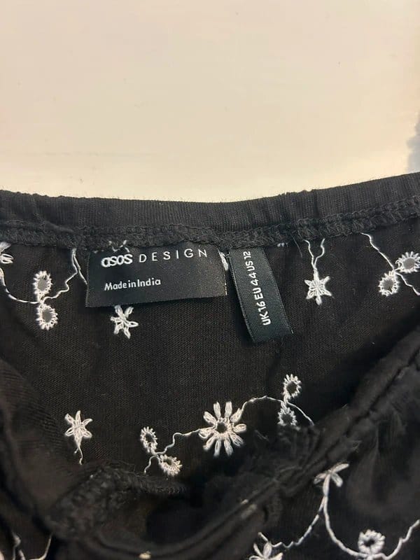 Stylish corset-style top by ASOS in black with white floral embroidery. Features lace straps for a cinched waist effect. Perfect for adding a touch of elegance to your wardrobe.