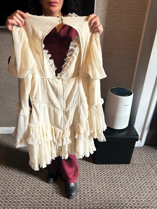 Elegant cream embellished dress in UK size 12. Features a statement ruffle detail with bead embellishments and an open back design. A very flattering piece for occasions or holidays.