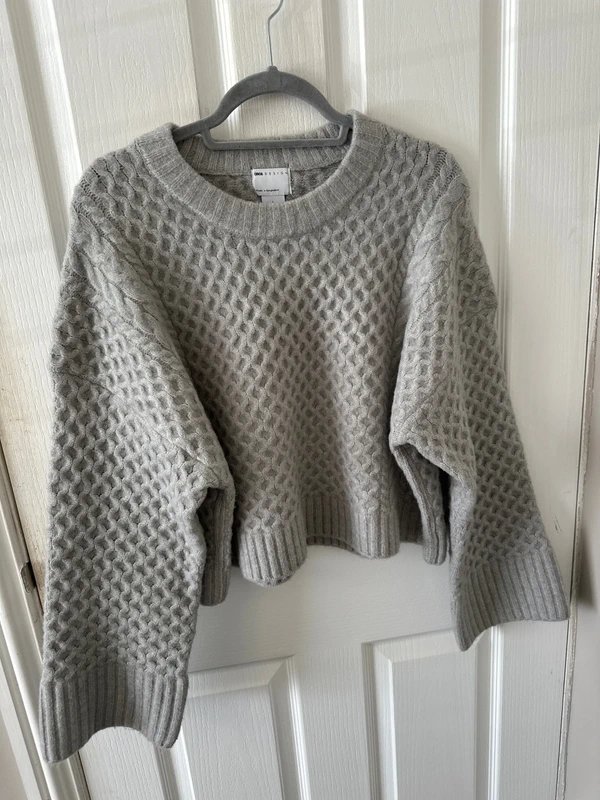 The ASOS Crew Neck Boxy Jumper with Wide Cuff in Cable Knit in Grey is available in sizes L.