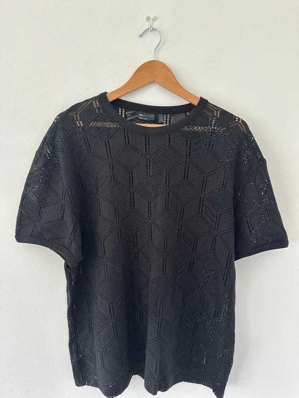 Stylish black crochet tee from ASOS featuring a geometric pattern and lace-like texture. Perfect for a casual yet chic look.