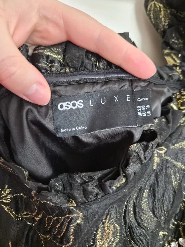 Stylish ASOS LUXE cropped embellished top in black with gold metallic embellishments. Features a fitted silhouette and short, puffed sleeves. Perfect for evening events or special occasions.