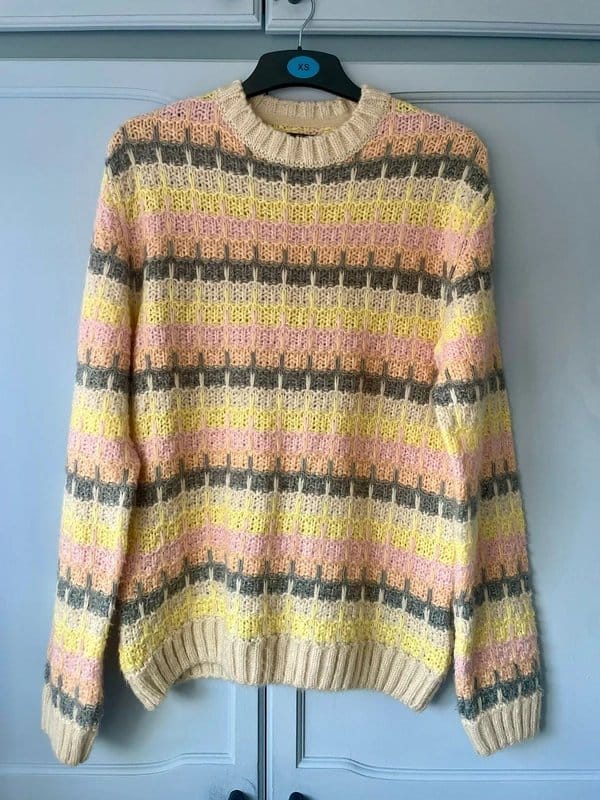 “Pair this jumper with light blue jeans and white sneakers for a relaxed, casual look.”