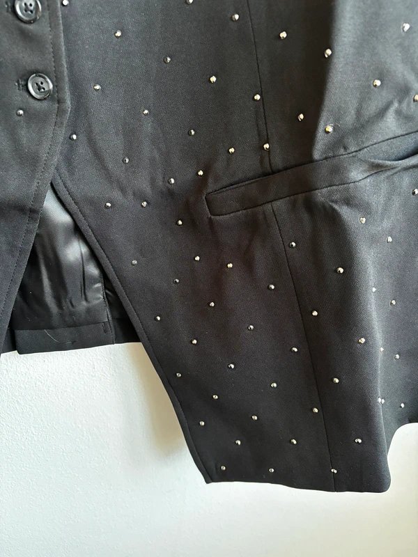 Featuring a diamanté embellishment and a button closure, this black waistcoat adds a touch of glamour to any outfit. Perfect for evening events or to elevate your casual look.