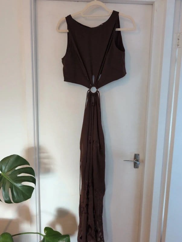 Summer-ready and brand new with tags, this brown floral midi dress features a cut-out design for a modern touch. Perfect for casual outings, it's crafted with a slim fit for a flattering silhouette.