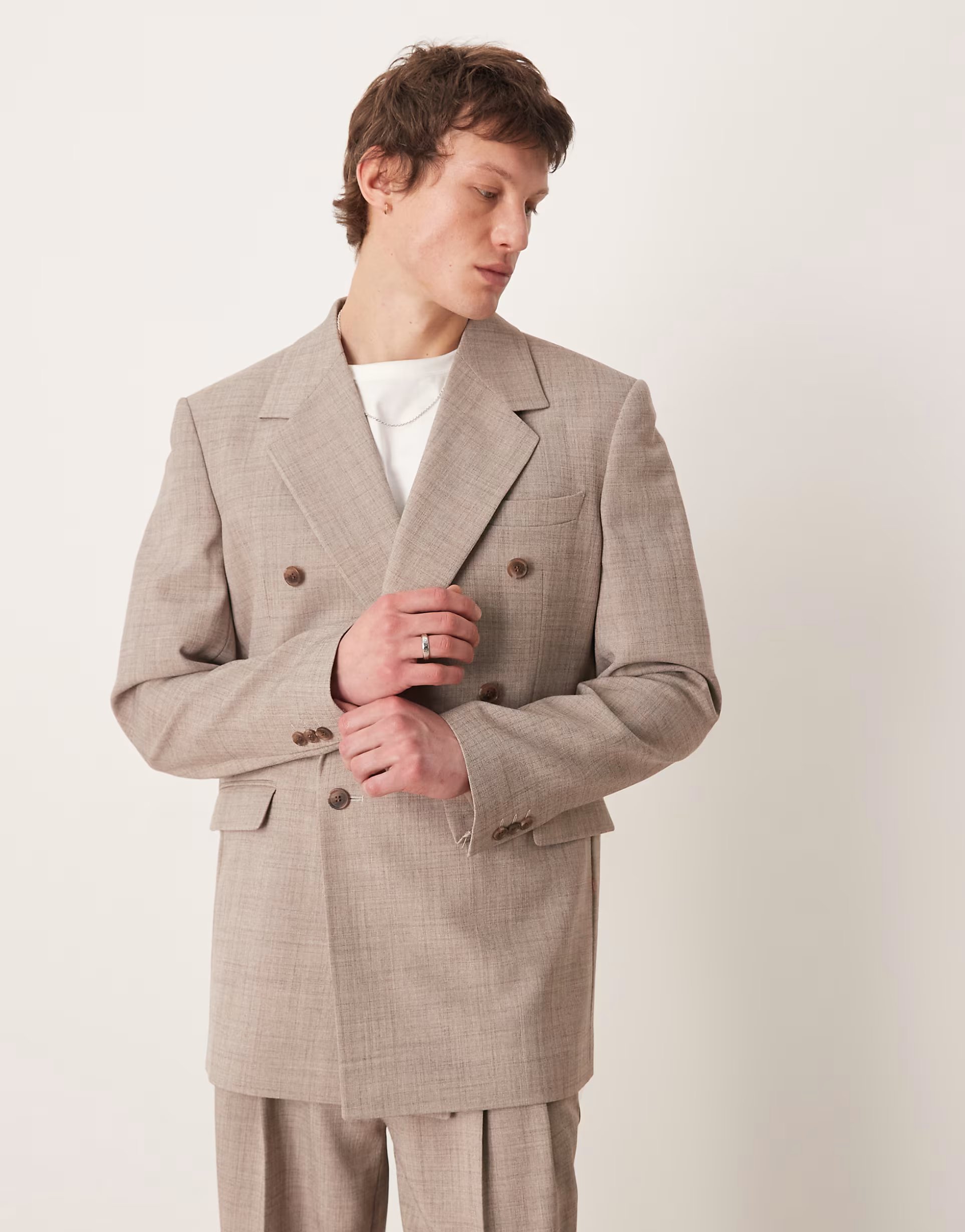 The ASOS DESIGN Relaxed Square Shoulder Suit Jacket in Beige Crosshatch offers a modern take on classic tailoring. Featuring a double-breasted front, double-button closure, and crosshatch pattern, this piece is perfect for a sophisticated yet laid-back look.