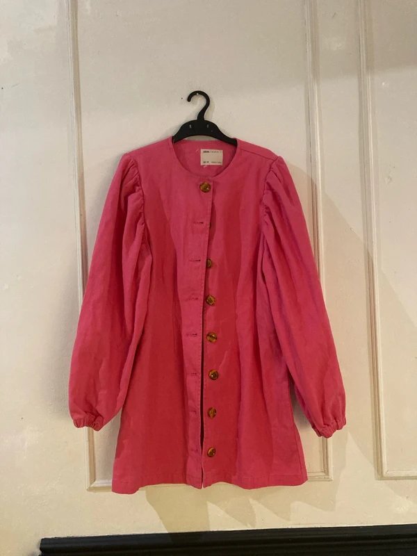 A vibrant pink denim dress featuring puff sleeves and a button front, perfect for casual outings.