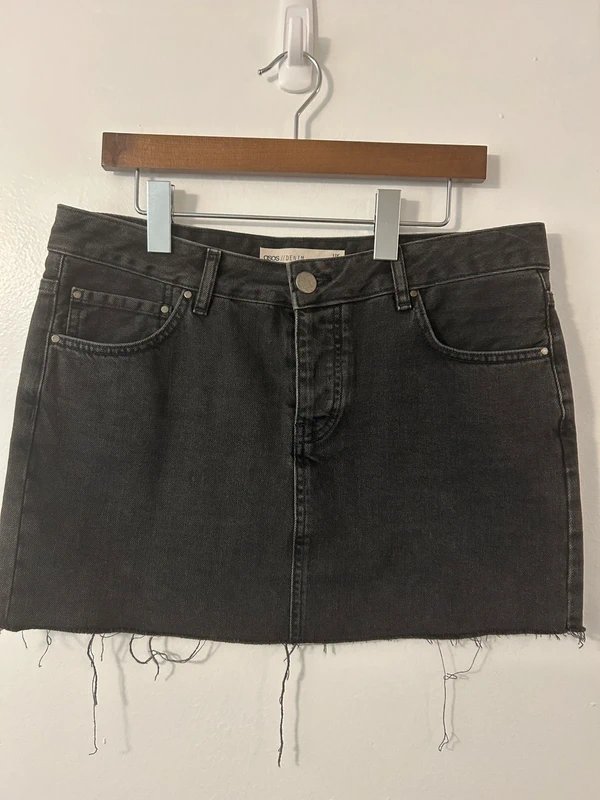Black Denim Skirt — the must-have casual piece for any wardrobe. Designed in classic black, this mini skirt features distressed detailing and a straight leg style. Crafted from 100% cotton denim, it offers a relaxed fit and button closure. Perfect for pairing with a variety of tops for a casual look.