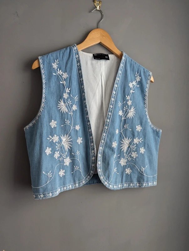 The ASOS Denim Embroidery Waistcoat in Light Blue is available in sizes M.
