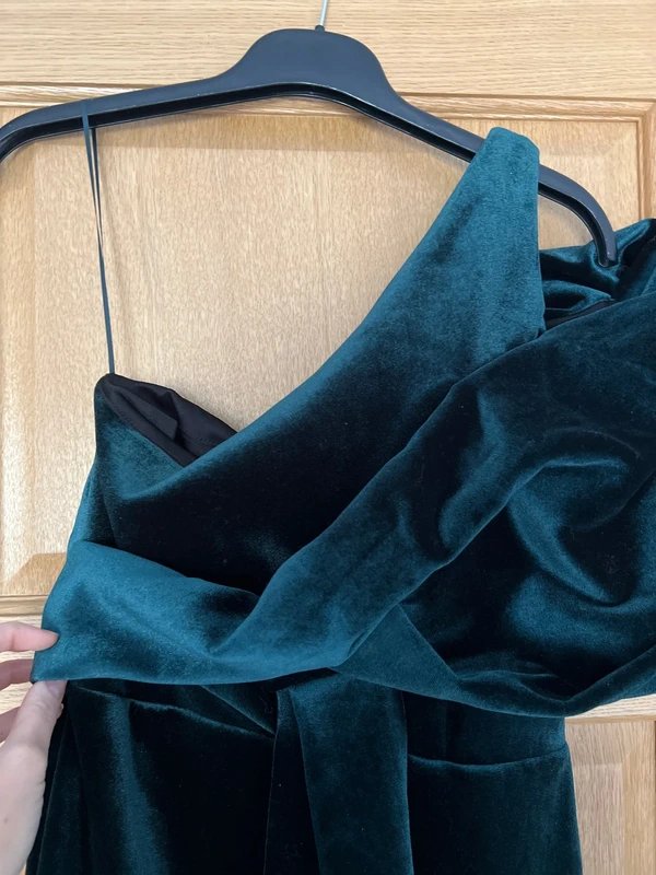 This forest green velvet pencil midi dress is flattering and very comfy. The dress feels heavy but is surprisingly comfortable when worn. It was worn once at an October wedding.