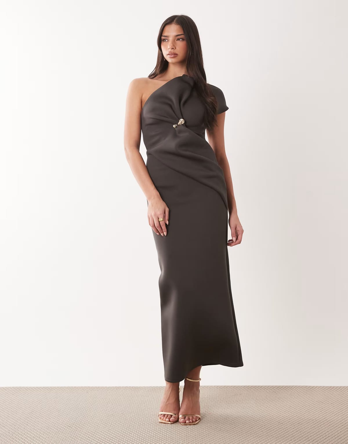 See all outfit ideasStylish brown scuba-style fabric midi dress with an asymmetric one-shoulder neckline and a gathered trim. Perfect for evening events or special occasions.