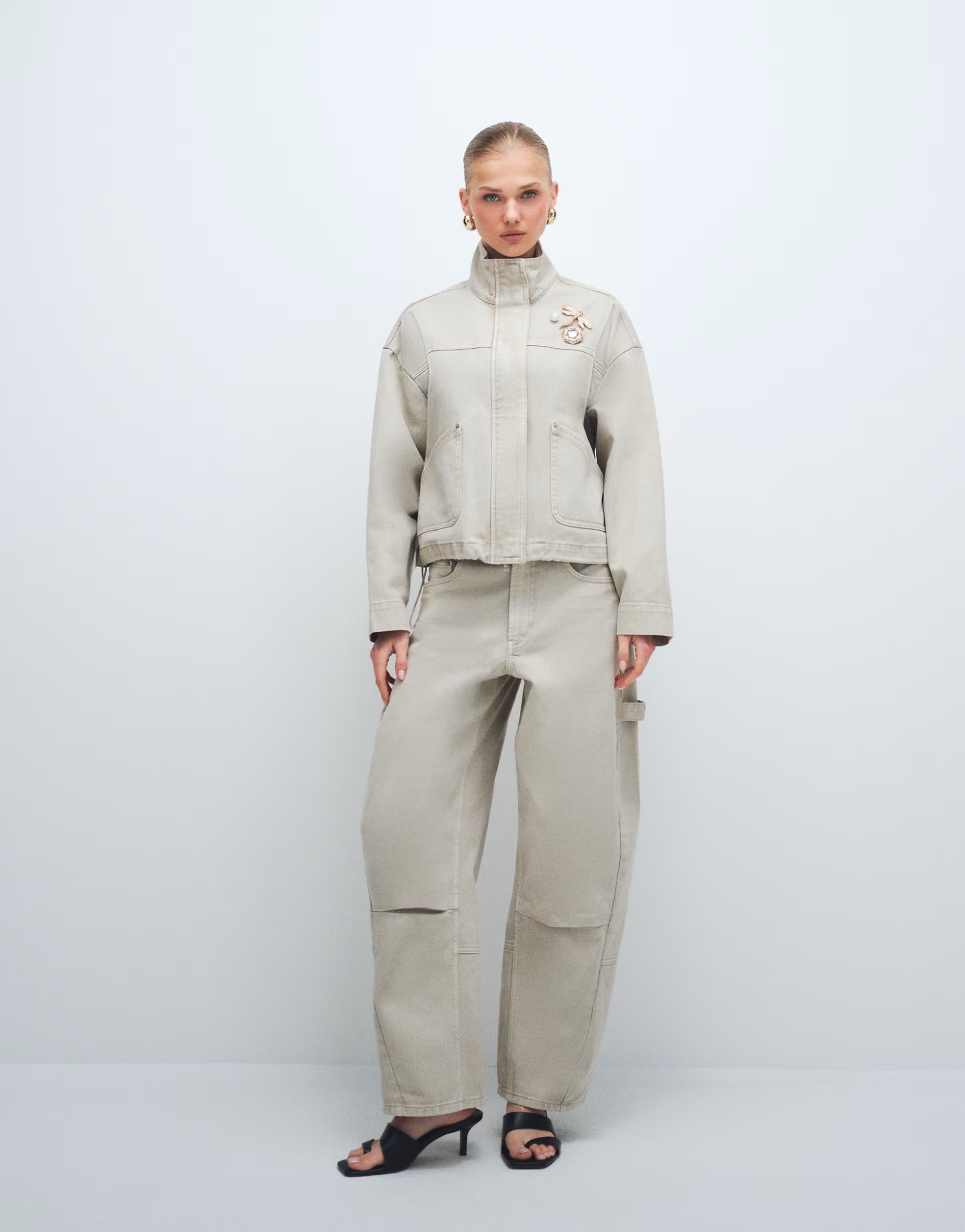 Crafted with neutral tones, this co-ord features an aviator barrel jean paired with a denim funnel jacket. Perfect for a relaxed yet stylish look.