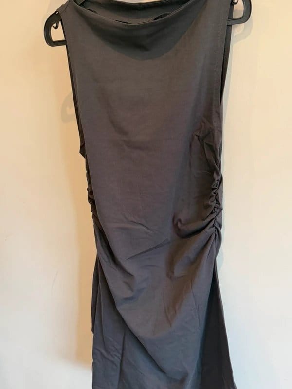 Elegant black sleeveless mini dress with a boat neckline and ruched side detailing. Made from a stretchy, slightly shiny fabric, this dress offers a flattering and modern silhouette. Perfect for evening events or casual outings.