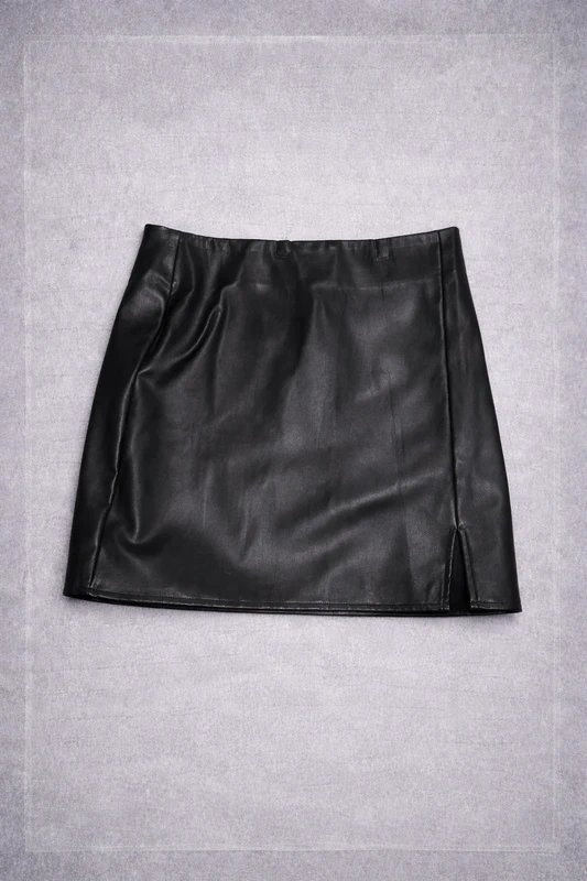 Designed with black faux leather, this high-waisted mini skirt features a clean, structured silhouette with a subtle side slit detail. Perfect for a sleek, minimal look.