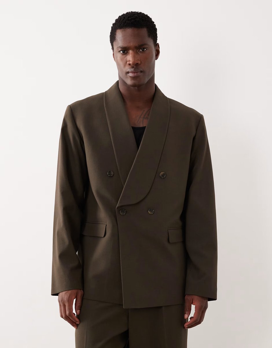 Designed with olive green fabric, this boxy cropped shawl suit jacket from ASOS DESIGN features a double-breasted front with two-button closure. Perfect for a modern look, it's ideal for both casual and semi-formal occasions.