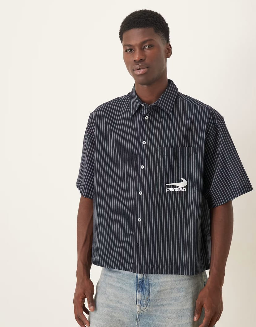 The ASOS Boxy Oversized Embroidered Shirt in Navy is ideal for casual, smart-casual.