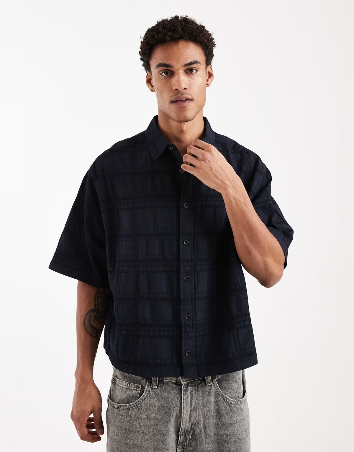 The ASOS Boxy Oversized Shirt with Textured Check in Black is ideal for casual.