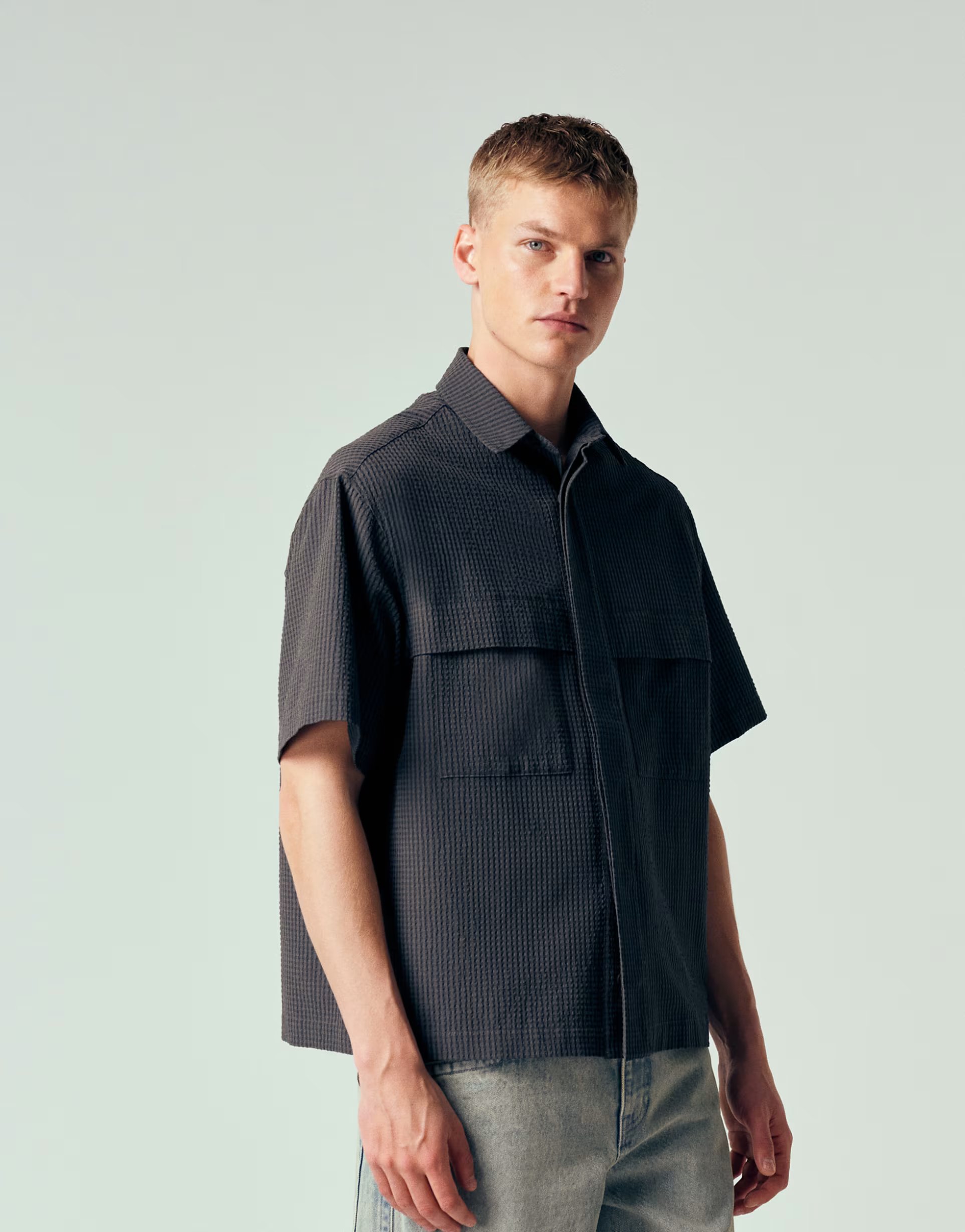 Crafted with a boxy oversized fit and a textured seersucker fabric, this charcoal shirt by ASOS DESIGN exudes effortless style. Perfect for layering over casual wear or wearing on its own, this piece is versatile for various occasions.