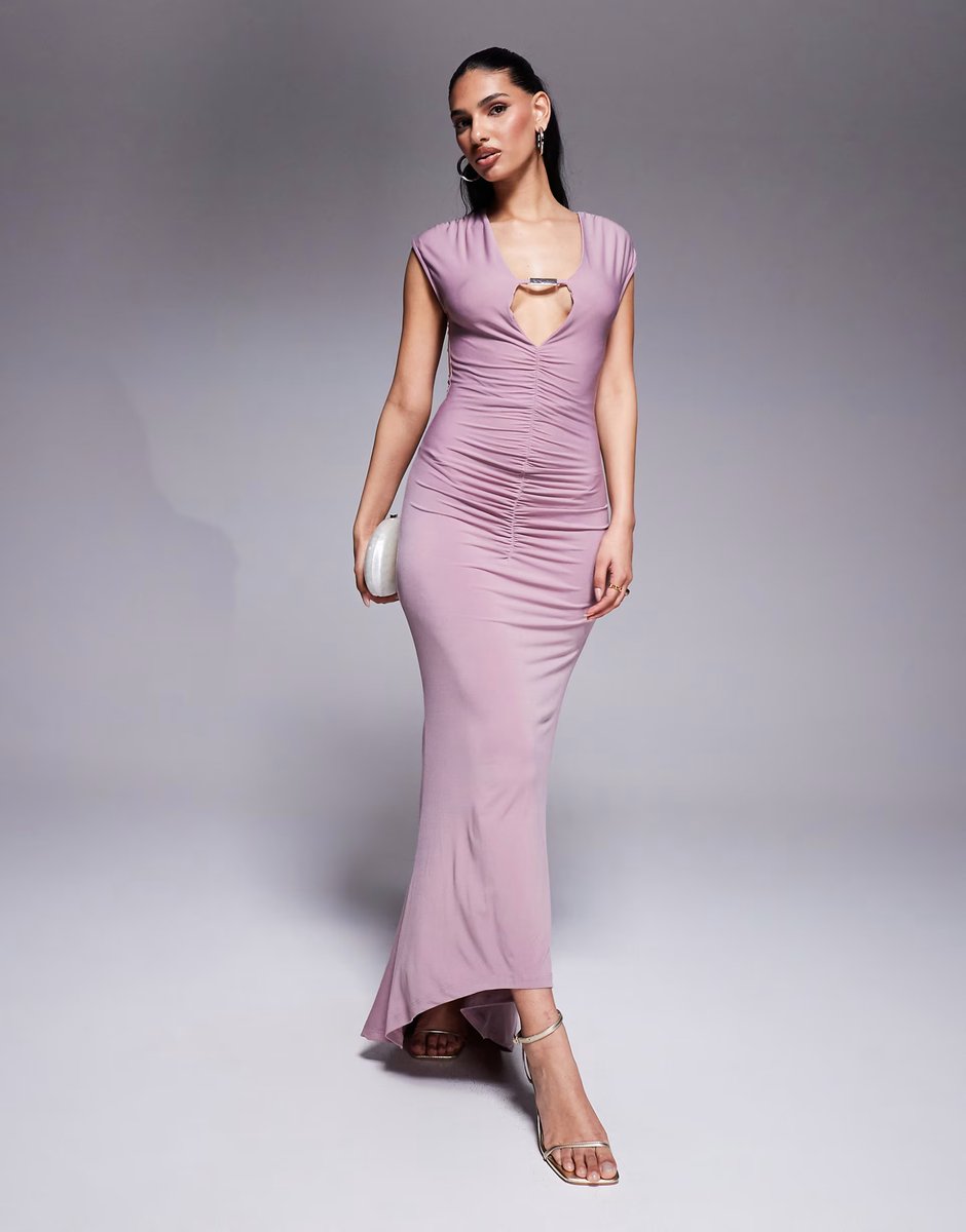 The ASOS DESIGN Cap Sleeve Ruffle Maxi Dress in Mauve is ideal for evening, party, formal.