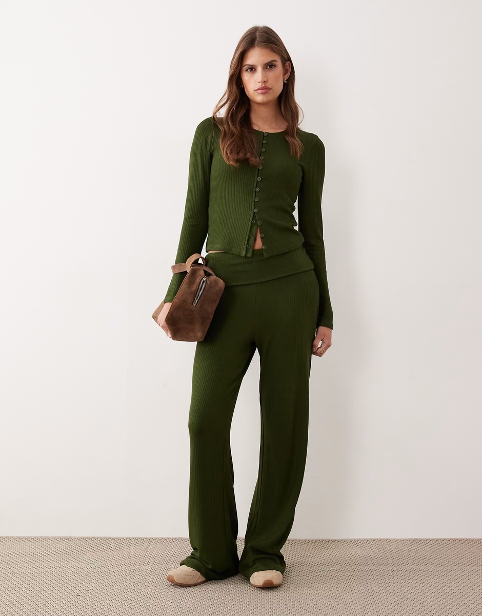 The ASOS Ruched Cardigan and Trousers Co-ord in Dark Olive is ideal for casual, smart-casual, work.