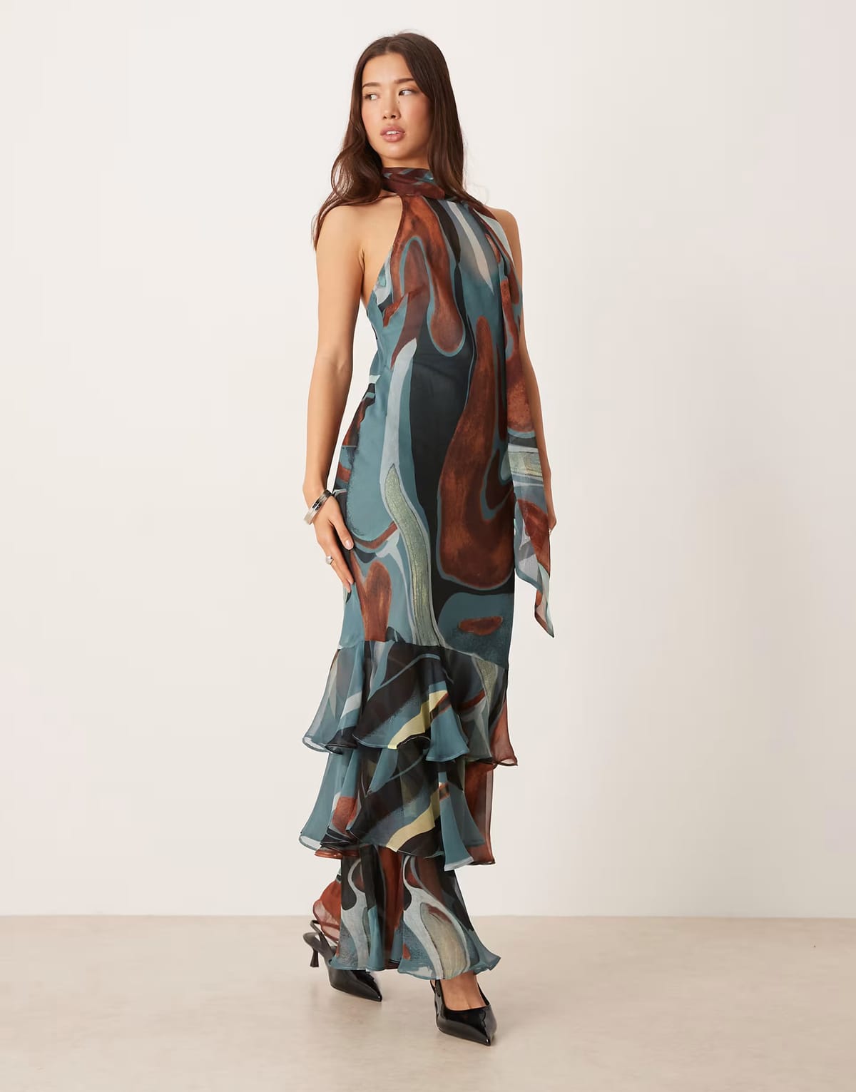 The ASOS Chiffon Halter Maxi Dress with Scarf Detail in Blue Abstract is ideal for evening, casual.