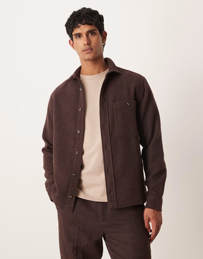 The ASOS Wool Co-ord Overshirt in Brown is made from wool.