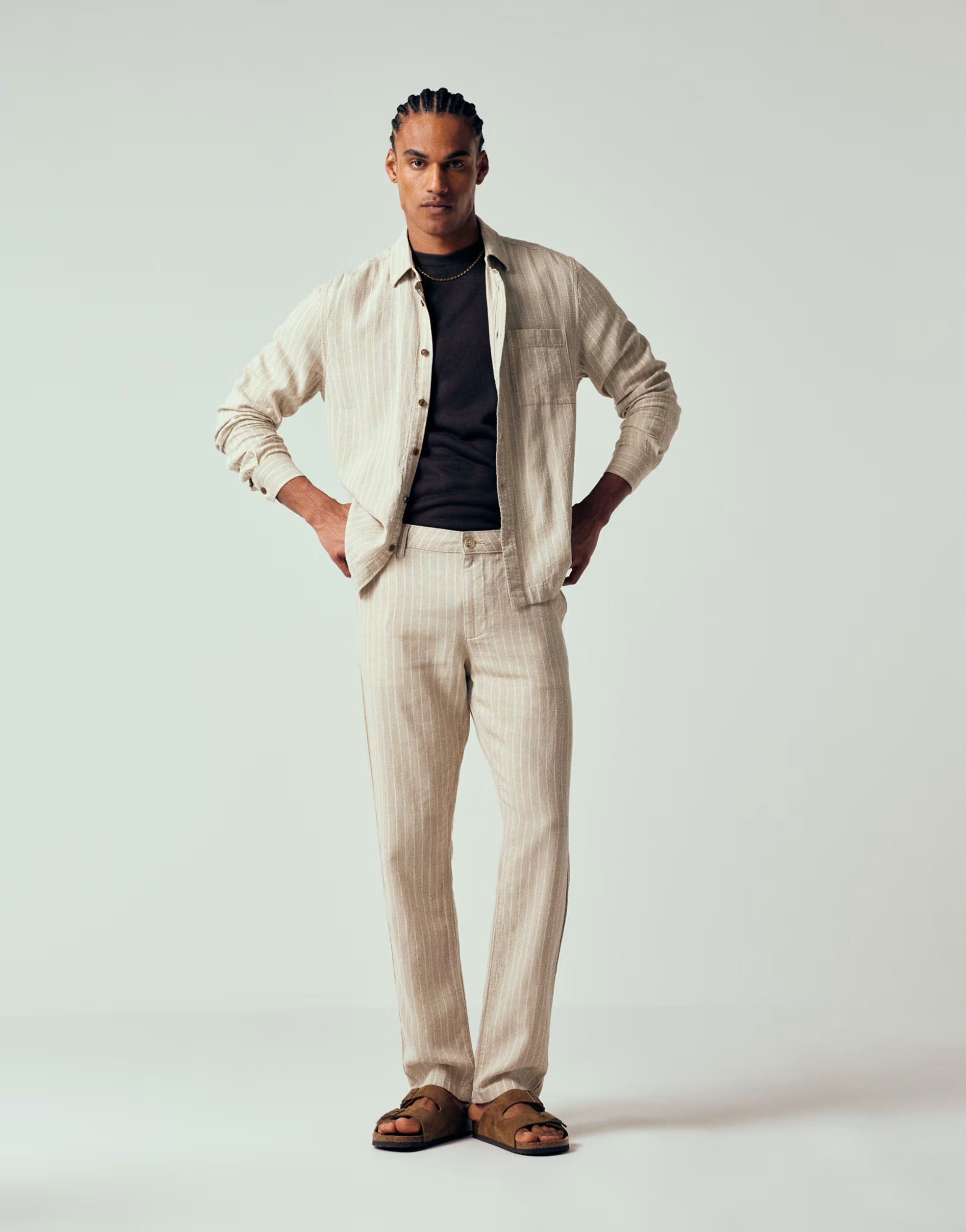 Crafted from a linen blend, these stripe slim fit trousers offer a casual yet polished look. Perfect for business casual occasions, they provide a comfortable fit with a timeless design.