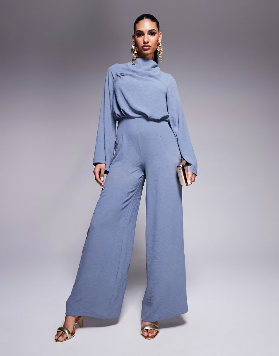 The ASOS Cowl Neck Long Sleeve Jumpsuit in Dusky Blue is ideal for evening.