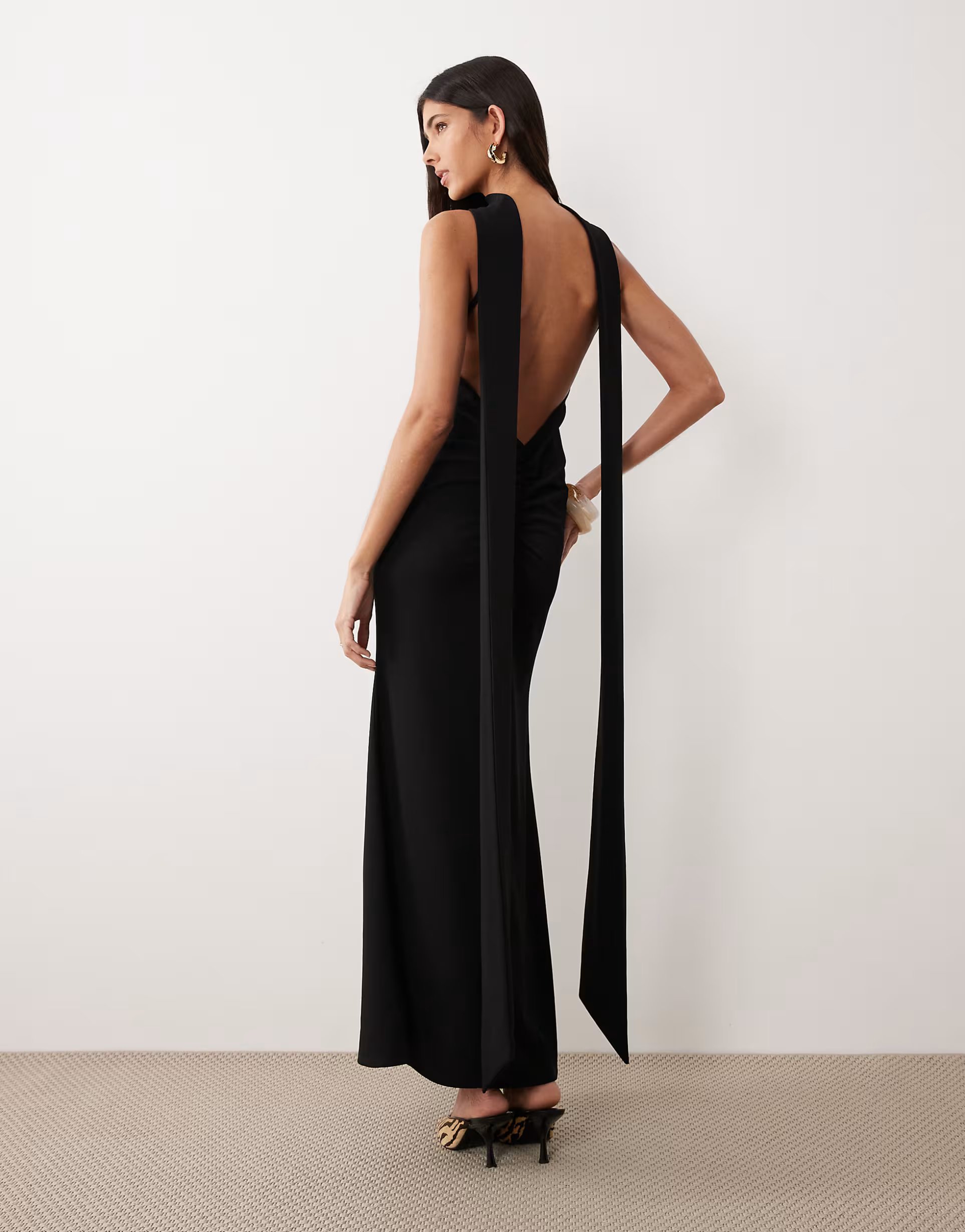 The ASOS Crepe Scarf Detail Plunge Back Dress in Black is made from crepe.