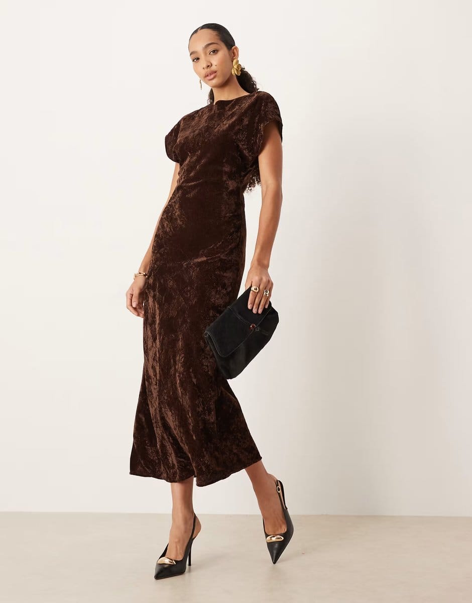The ASOS Velvet Crew Neck Midi Dress in Chocolate is ideal for casual, evening.