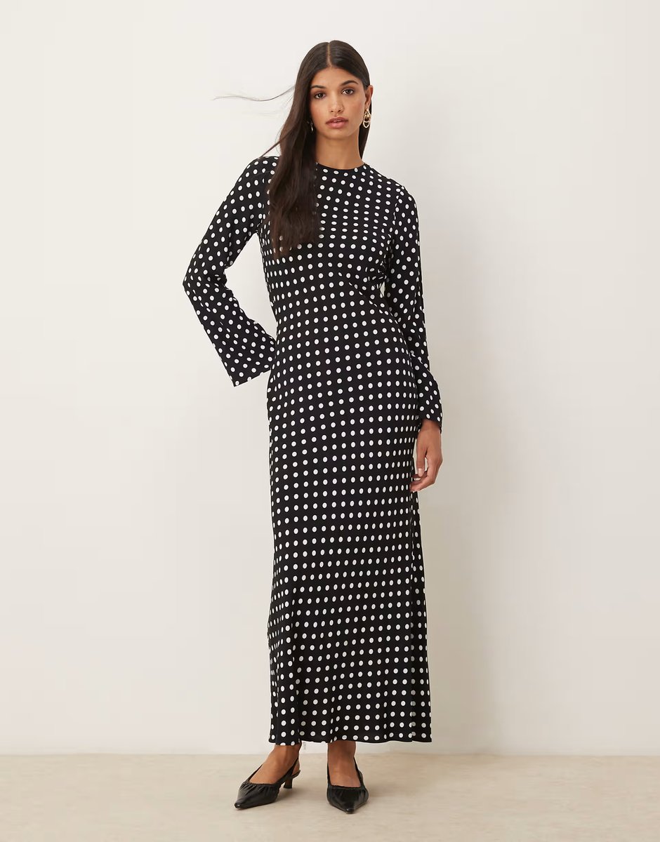 The ASOS Crew Neck Stripe Maxi Dress with Polka Dots in Black Spot is ideal for casual, evening.