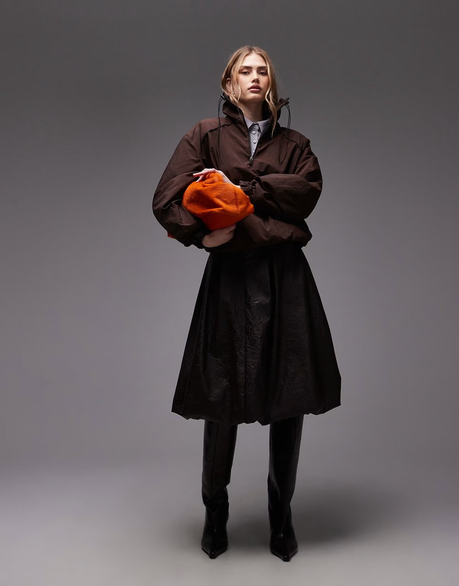 Chocolate Faux Leather Bubble Skirt — the must-have addition to your wardrobe for a bold, statement look. Designed in chocolate, this faux leather bubble skirt features a textured crinkle finish and a fluffy, full-circle skirt. Ideal for adding an edgy twist to any outfit.