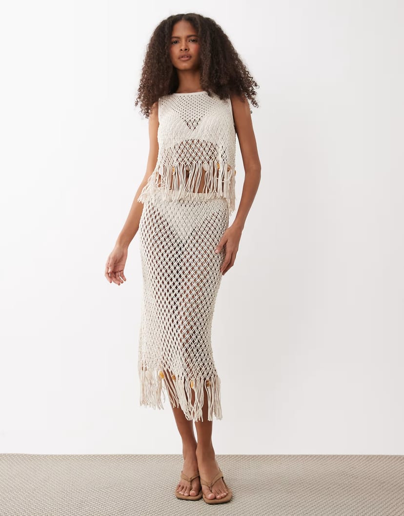 This ASOS co-ord features a crochet top with fringed details and a beaded skirt. The white colour adds a touch of elegance, perfect for summer outings.