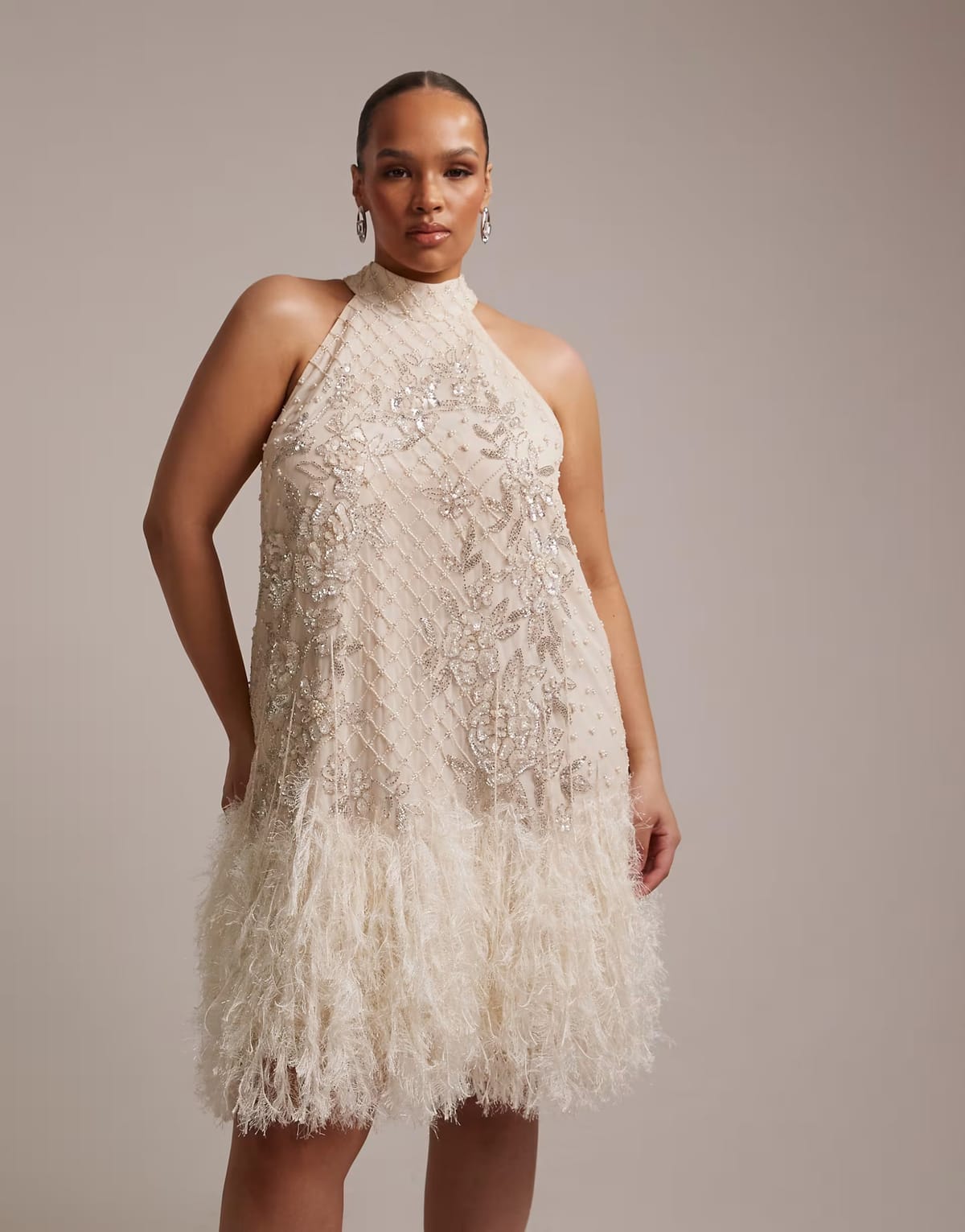This ivory mini dress by ASOS DESIGN Curve features a floral embellished halter neckline and a faux feather hem. Crafted from a sparkly fabric, it's perfect for evening events or special occasions.
