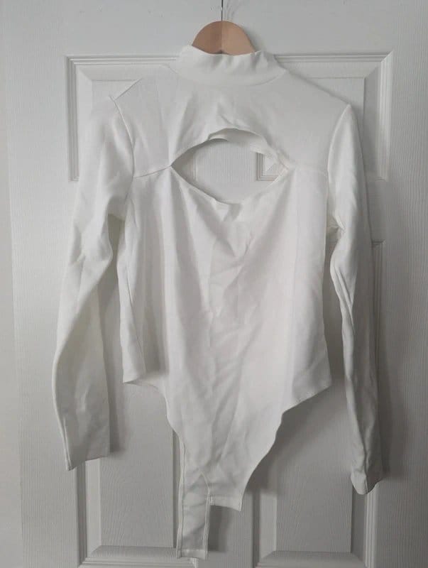 Featuring a luxe white finish, this long sleeve bodysuit boasts a sleek cut-out design for a contemporary touch.